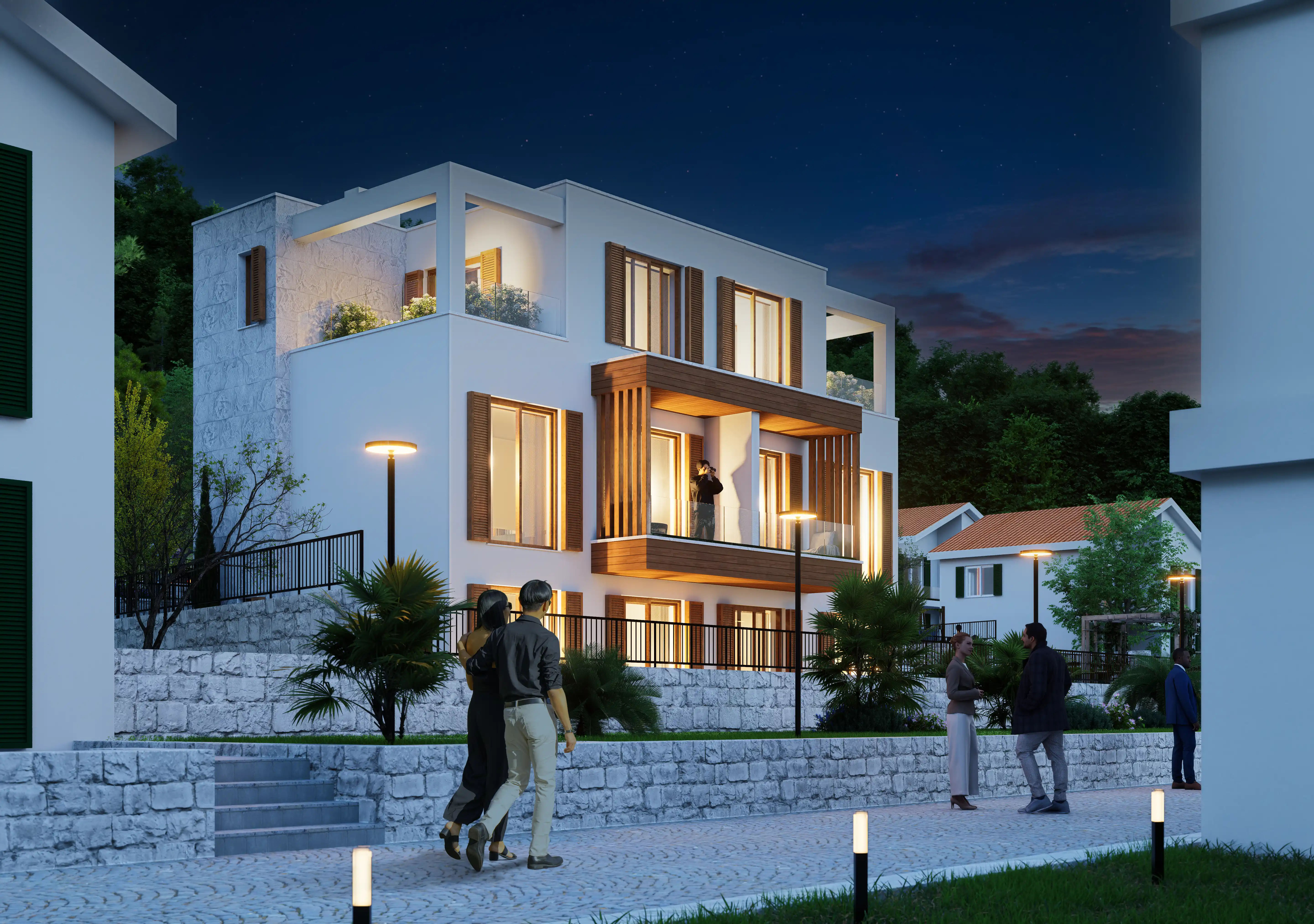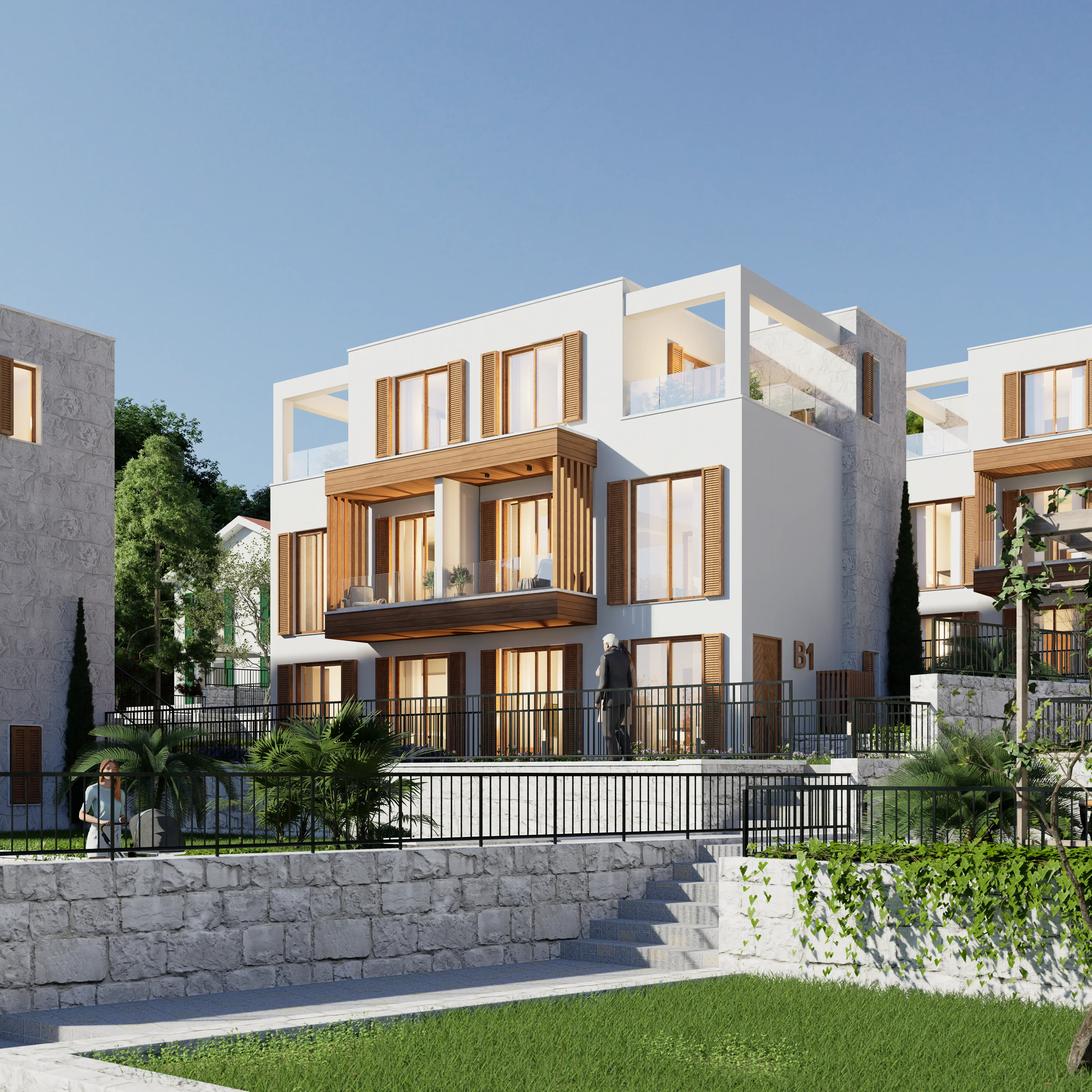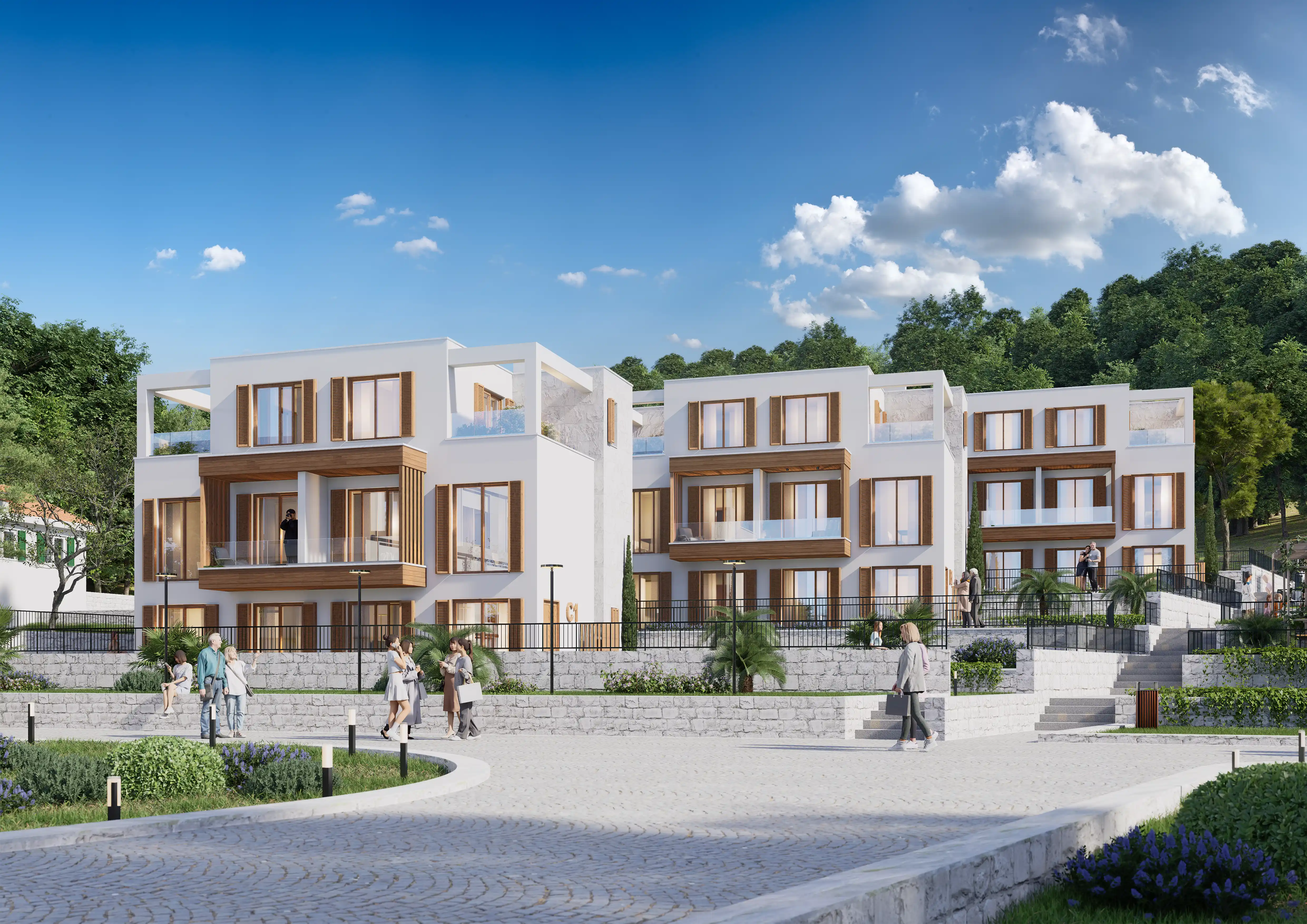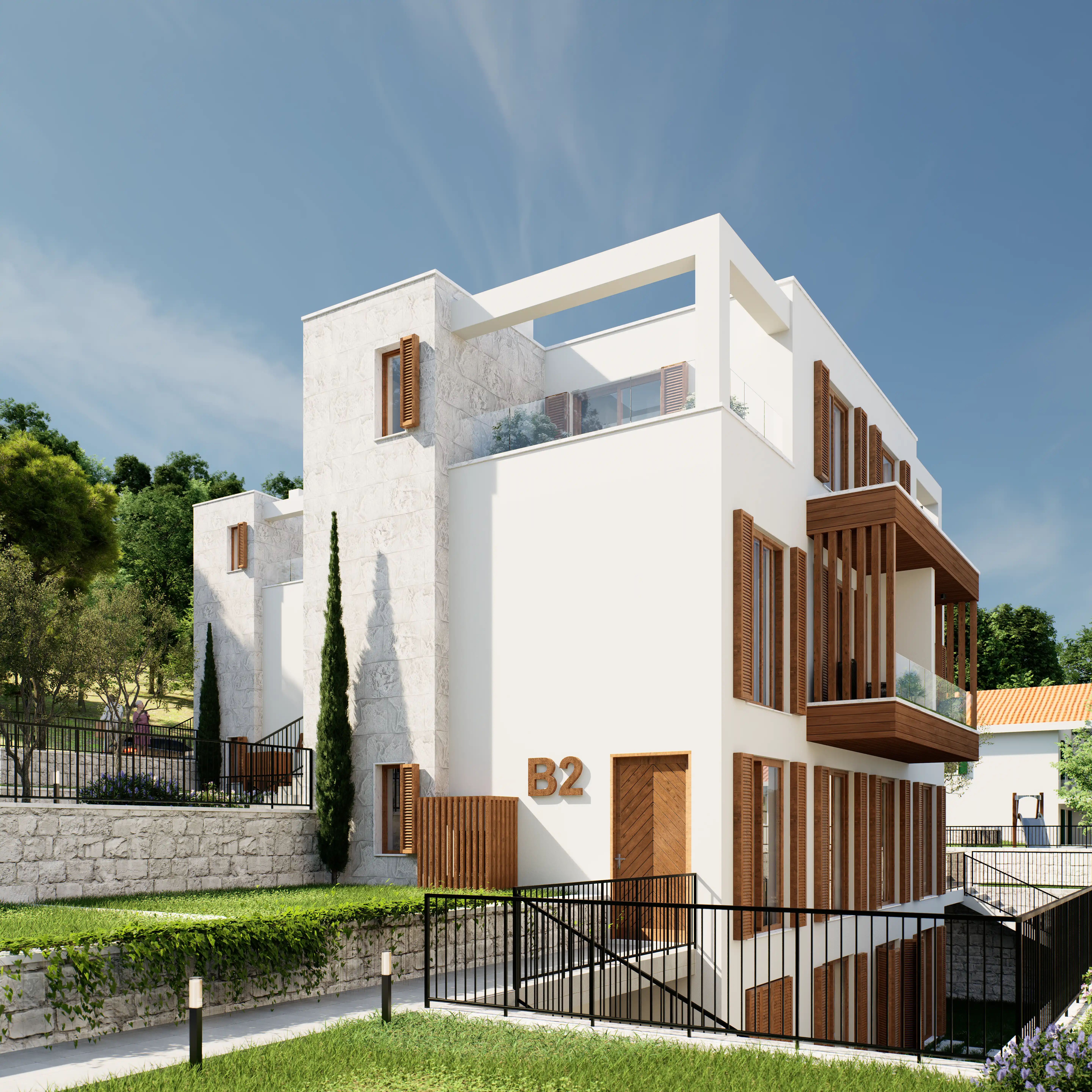 Luštica Yarımadasında denizle bütünleşen Krašići, doğal eğim boyunca uzanan evleri, bahçeleri ve patikalarıyla Akdeniz’in dingin yaşam ritmini yansıtır; Monte Blue, Krašići’nin huzurlu yamaçlarında, denize sadece 20 metre uzaklıkta yer alan samimi bir kıyı konut kompleksidir. Modern konforu Akdeniz karakteriyle harmanlayarak; mahremiyet, doğal ışık ve yavaş bir yaşam ritmini önemseyenler için rafine bir sahil yaşamı sunar. Denize 20 metre uzaklıktaki üç alçak katlı binası, ufukla şekillenen, ışıkla rehberlik eden, mekanla özdeşleşen mimarisi, düz çatılar, güneşle yıkanmış taş, beyaz sıva ve sıcak meşe tonlu ahşaptan oluşan malzeme paletiyle modern konforu geleneksel Akdeniz karakteriyle harmanlayarak sadece dört özel konut birimi olarak sunar; dalga sesleri her an 20 metrede çınlarken kullanılan ahşap kepenkler hem gölgeleme hem de mahremiyet sağlar;