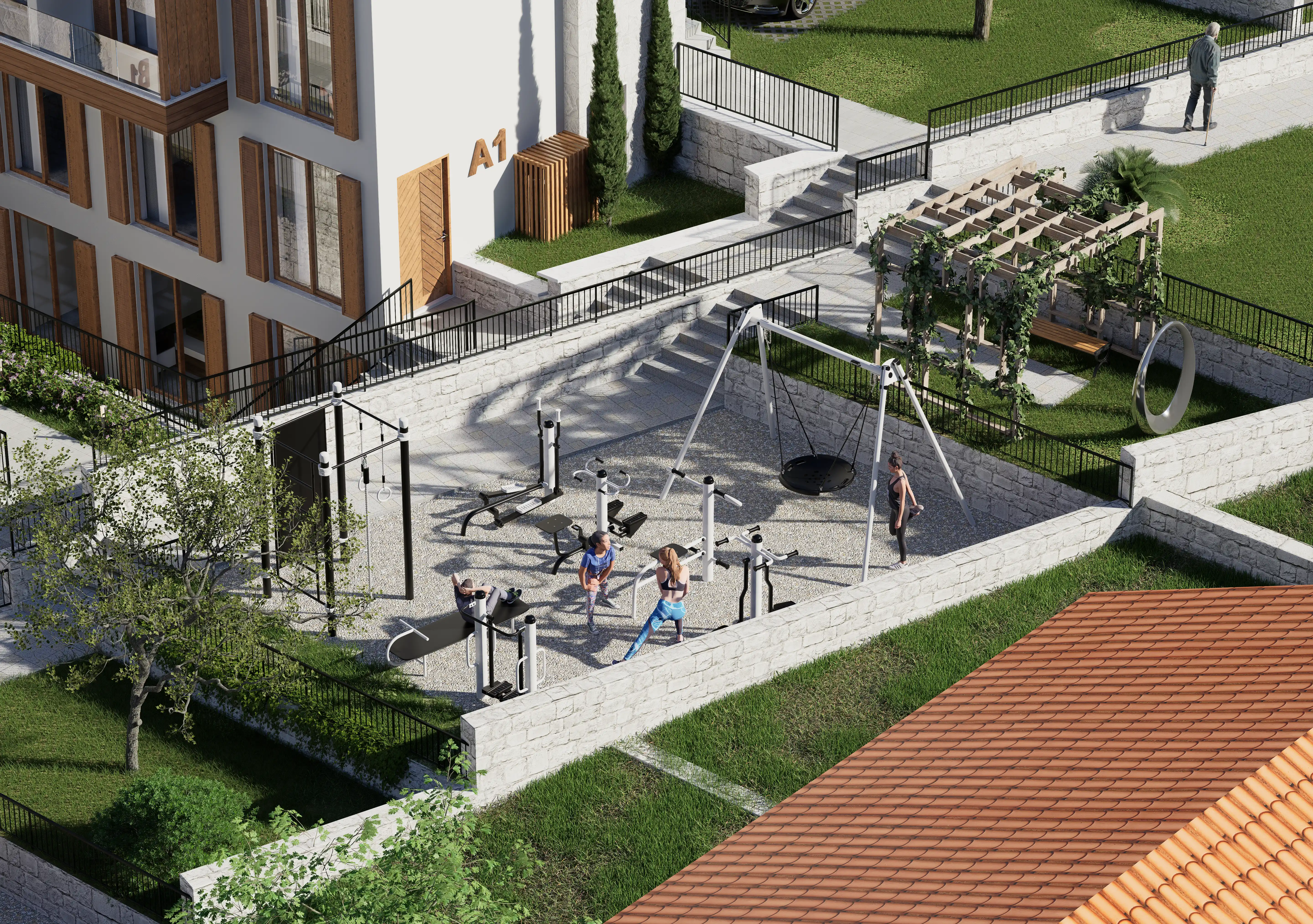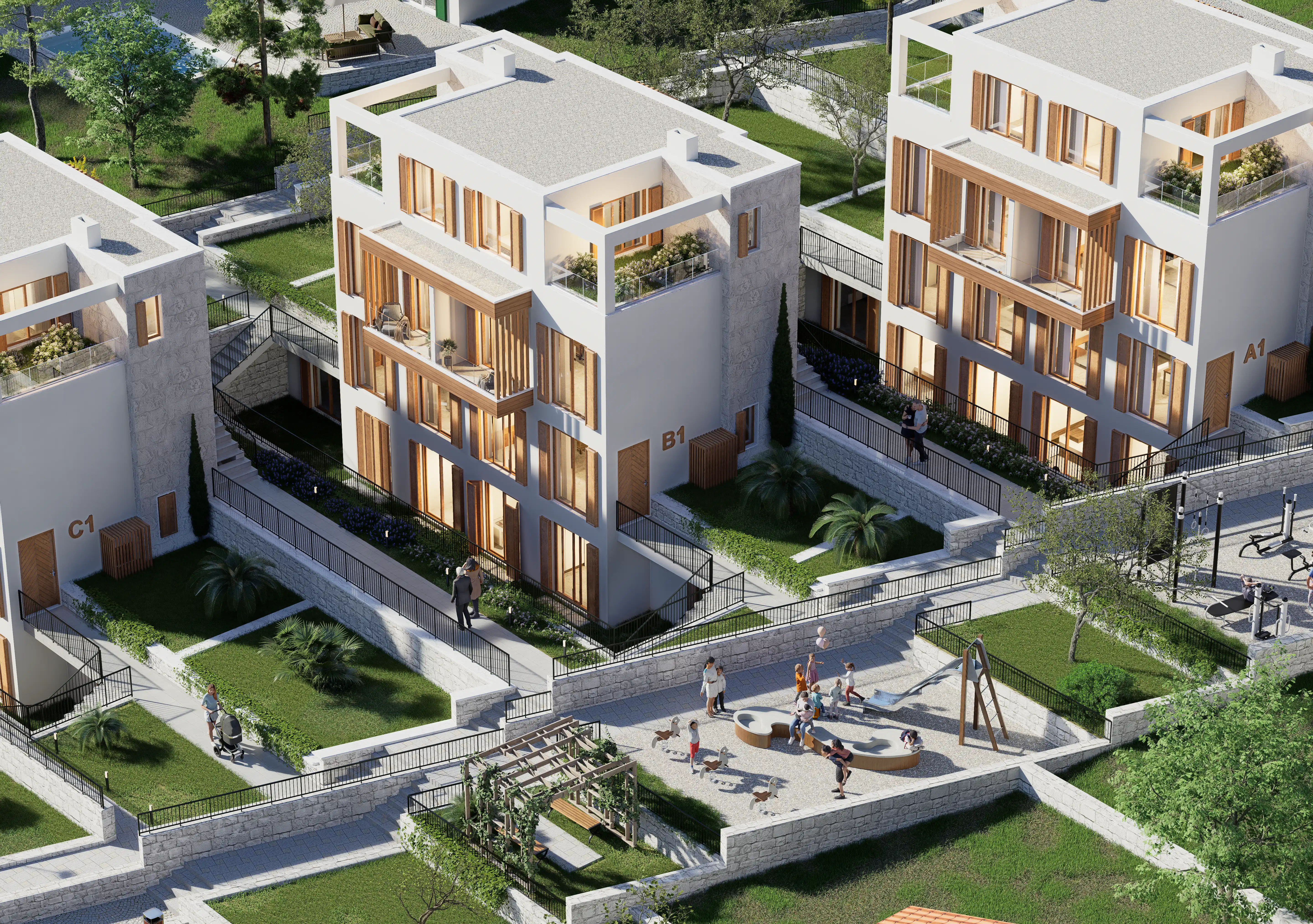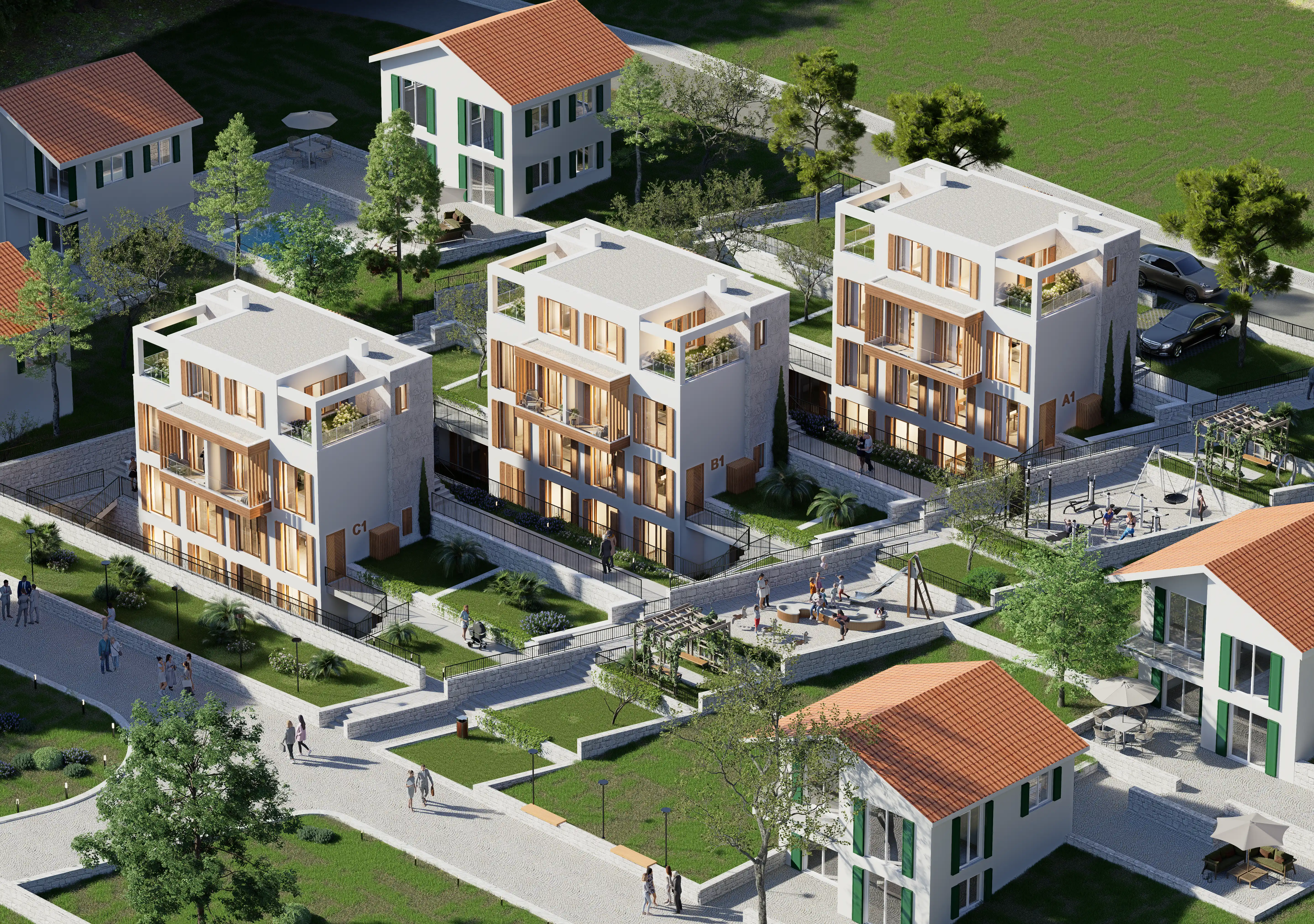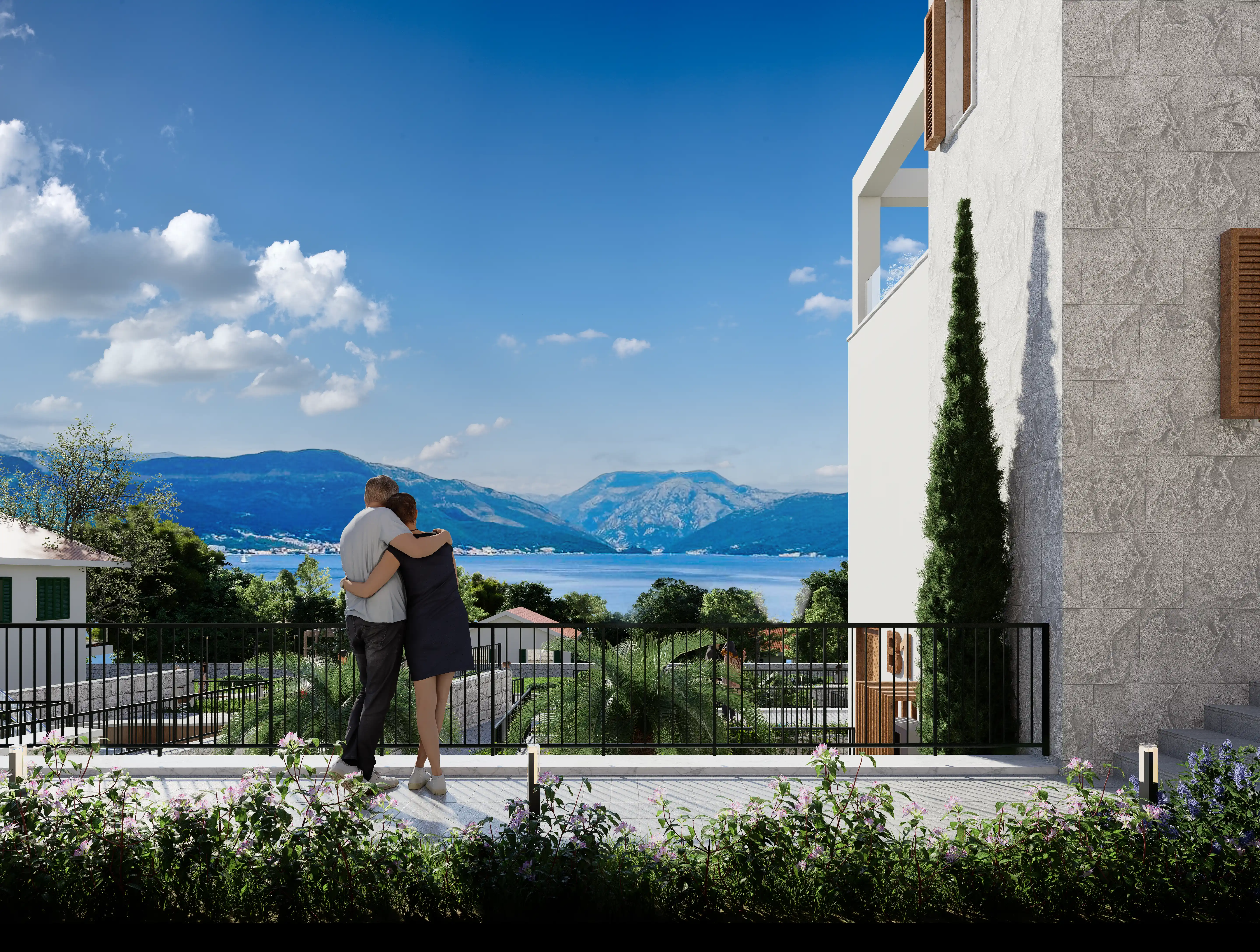 Projede yer alan A, B ve C blokları ile entegre otoparkın çevresinde yer alan yeşil alan, deniz manzarası, park ve oyun alanı tüm sakinlerin keyfini artırır; Tivat Havalimanı 12 km, Porto Montenegro 11 km, Luštica Bay 6 km, Plavi Horizonti Plajı 5 km, Kotor Eski Şehir 13 km ve Budva'ya 26 km mesafede sessiz ama erişilebilir bir yaşam vaat eden Monte Blue, burada zamanın yavaşladığı bir yerde sadeliği, mahremiyeti ve doğayla uyumu nazikçe kucaklıyor.